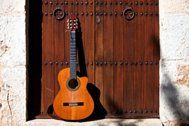 guitarra flamenca apoyada sobre una puerta
